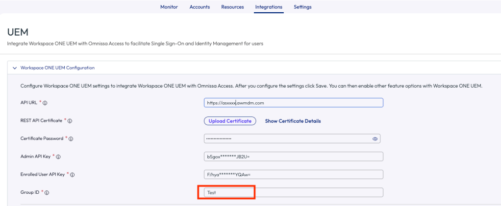 - Integrations → UEM → Workspace ONE UEM Configuration